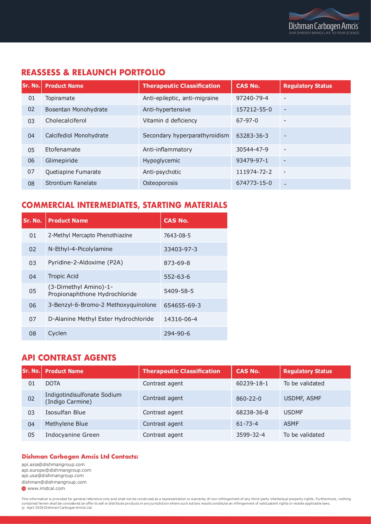 Dishman Carbogen Amcis Ltd has developed and manufactured several niche and high added-value Generic APIs in specific therapeutic fields. Our product portfolio focuses on complex intermediates and APIs and covers specific therapeutic areas such as anesthetics, contrast media agents for diagnostics, ophthalmic treatments, laxatives, organophosphate antidotes.