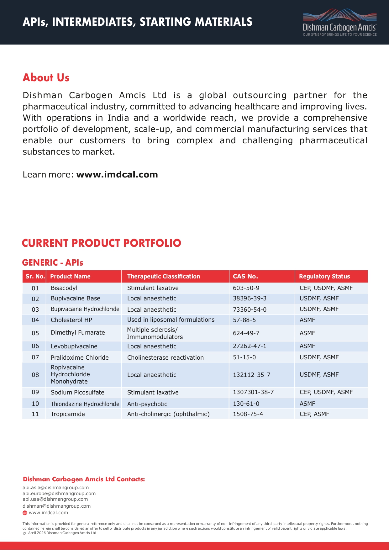 Dishman Carbogen Amcis Ltd has developed and manufactured several niche and high added-value Generic APIs in specific therapeutic fields. Our product portfolio focuses on complex intermediates and APIs and covers specific therapeutic areas such as anesthetics, contrast media agents for diagnostics, ophthalmic treatments, laxatives, organophosphate antidotes.
