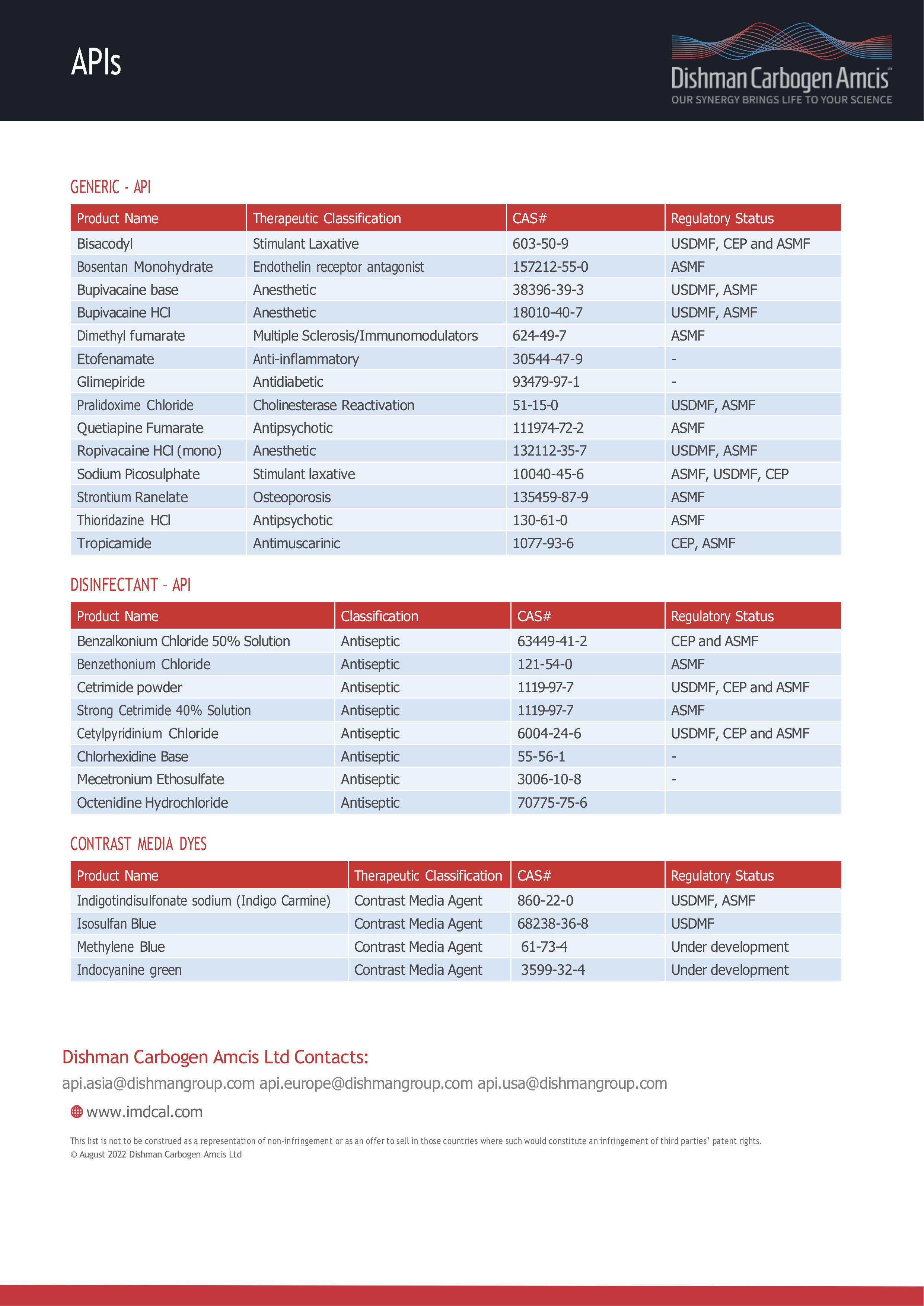 Dishman Carbogen Amcis Ltd has developed and manufactured several niche and high added-value Generic APIs in specific therapeutic fields. Our product portfolio focuses on complex intermediates and APIs and covers specific therapeutic areas such as anesthetics, contrast media agents for diagnostics, ophthalmic treatments, laxatives, organophosphate antidotes.